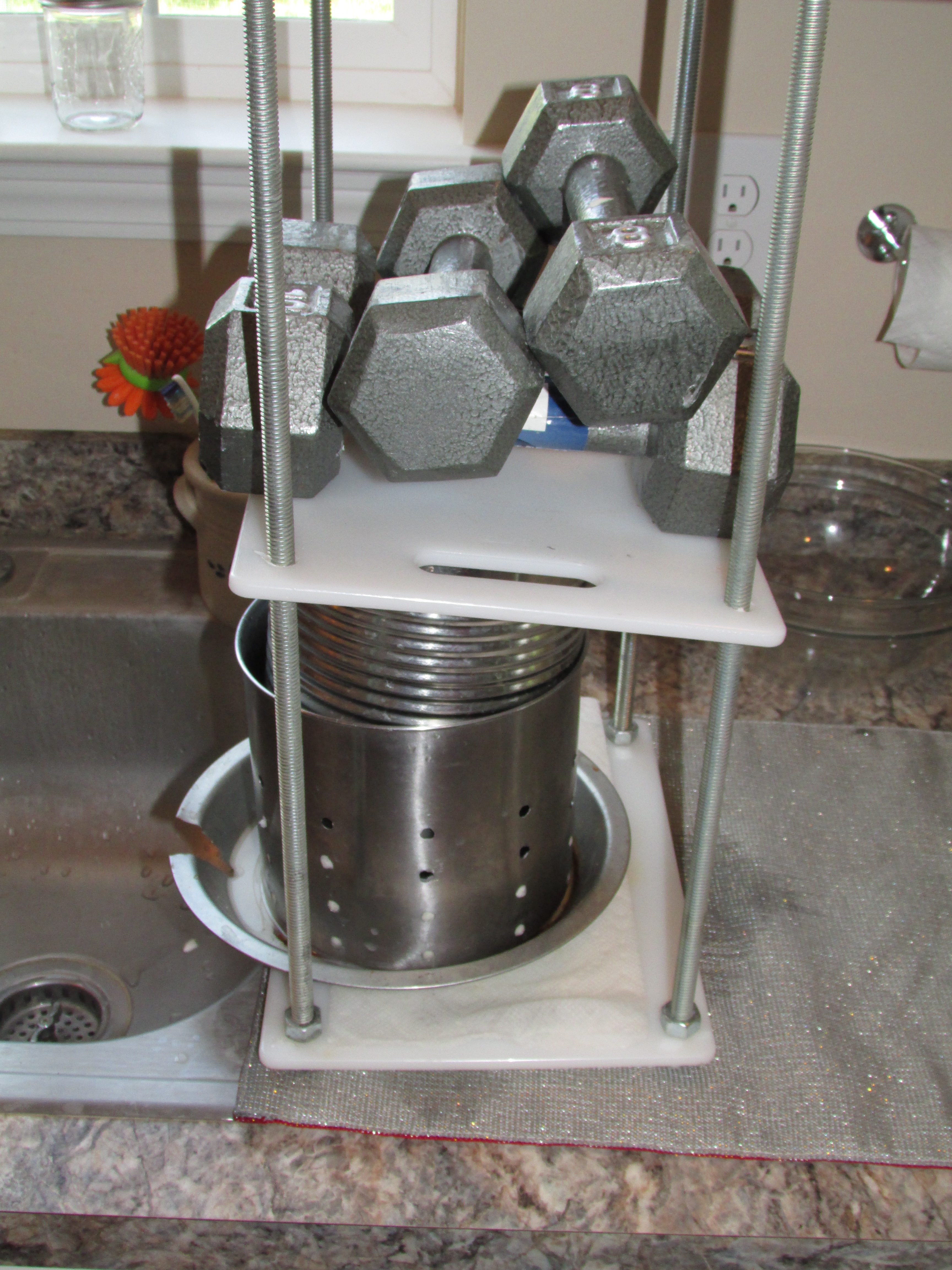 The press with weight applied. The press is constructed out of two cutting boards and some threaded rod. The “cheese mold” is a desk organizer with holes cut into it for drainage. An extra large empty metal can is used to press down on a plate inside the cheese mold.